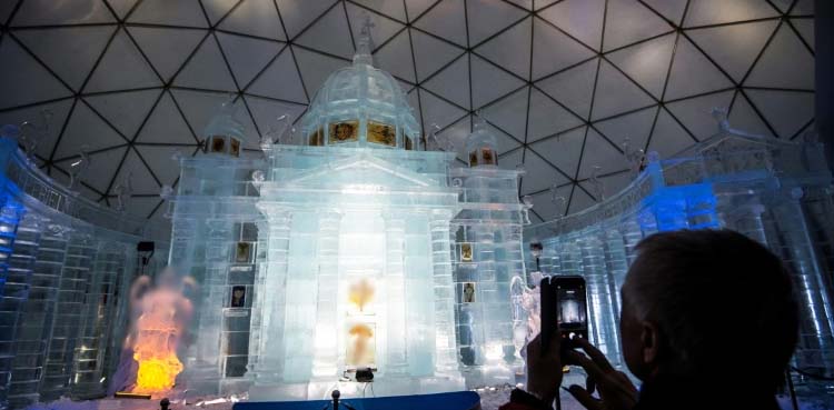A team of 16 sculptors from Slovakia, the Czech Republic, Poland, Wales and the United States worked 12 hours a day for a month to create this year’s ice temple.