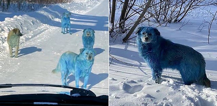 A group of stray dogs believed to have turned blue from pollution have been spotted near a disused factory in Russia.