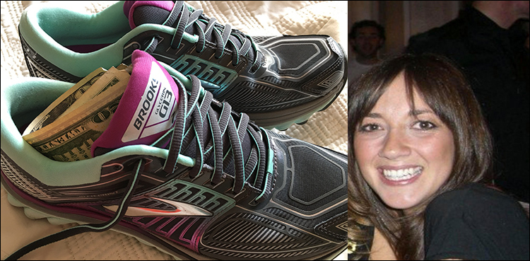 She bought the shoes and they were delivered to her, upon receiving she found out the sellar had forgotten to take the cash out before sending them her hay.