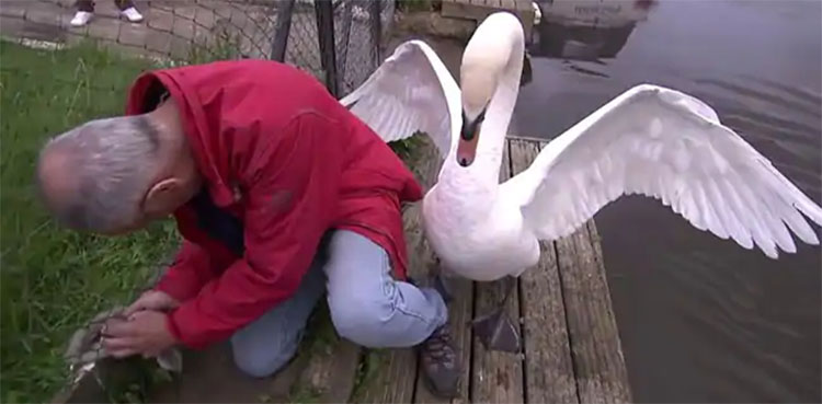 It shows the angry father swan flapping his wings furiously at the rescuer who, remarkably enough, kept his cool and continued working until the baby was rescued.