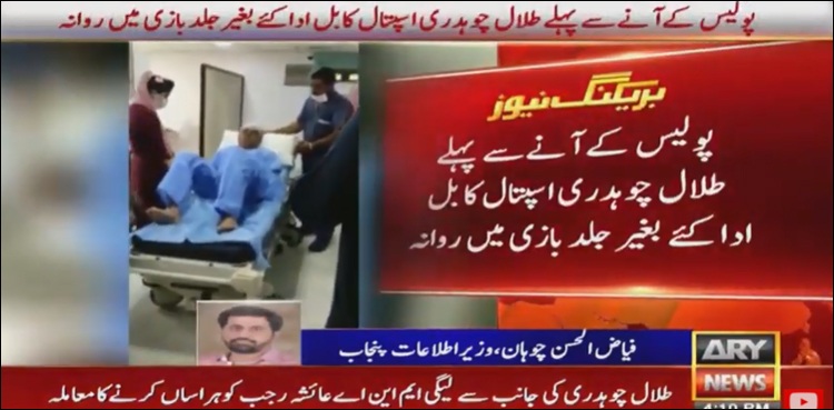The police reached National Hospital in Lahore, where Chaudhry was being treated, to record his statement but find an empty hospital room as Talal Chaudhry already left the hospital in a hurry without paying the bill, sources told ARY News.