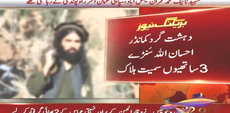In a major breakthrough, terrorist commander Ihsan Ullah alias Ihsan Sanray along with 3 other terrorists killed during an Intelligence Based Operation (IBO) today in Ghariom, Shaktu near the inter district boundary of North and South Waziristan. Ihsan Sanray masterminded (1/2) pic.twitter.com/IfVGZk9p4M