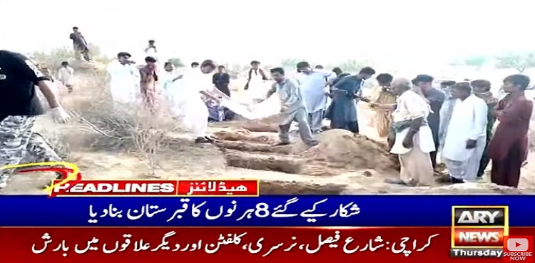 THARPARKAR: In a show of respect to nature, the people of Tharparkar laid eight killed deer were buried in Mithi, which were shot dead by three hunters, ARY News reported.