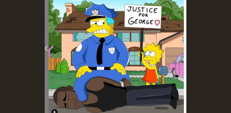 The image can also be found on Twitter, here and in a blog post which claimed “The Simpsons predicted Derek Chauvin kneeling on George Floyd’s neck in a 1990’s episode. During the episode the police character ‘Chief Wiggum’ stands on a black character’s neck as Lisa Simpson holds a sign saying ‘Justice for George’.”