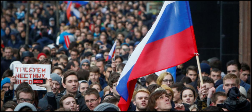 In Moscow, the crowd chanted “Happy birthday” and “Russia without Putin” and many held copies of the constitution and flags amid honks of support from passing cars.