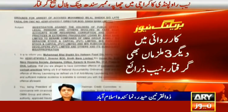 According to details, the NAB Rawalpindi arrested accused Bilal Sheikh, ex-president Sindh Bank, Tariq Ahsan, president Sindh Bank and Nadeem Altaf, executive vice president Sindh bank involved in corruption and awarding loans to Omni group through illegal means.