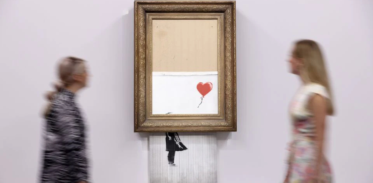 Onlookers gasped after the bottom half of the then titled Girl with Balloon was sucked into a shredder hidden in its frame as the hammer fell following a bid of 1,042,000 pounds at an October 2018 auction at Sotheby’s in London.