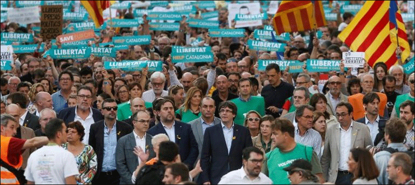 BARCELONA: Led by Catalonia’s separatist president Carles Puigdemont, hundreds of thousands of independence supporters protested in Barcelona on Saturday, shouting “freedom” and “independence” after Madrid announced drastic measures to stop the region from breaking away.