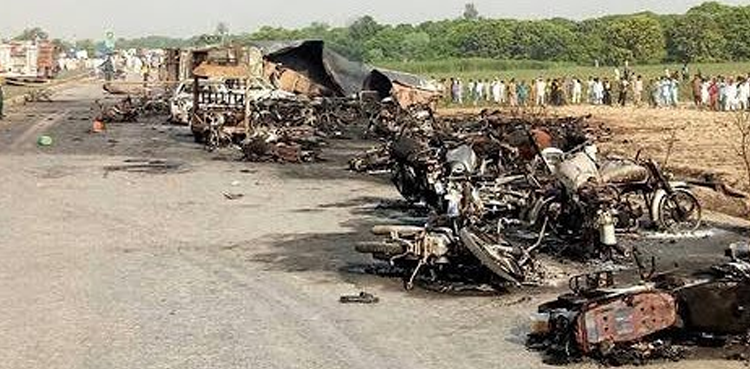 The flames swept through a large crowd trying to siphon leaking petrol from a truck that overturned as it swerved to avoid a motorcycle.