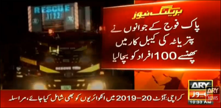 MUREE: Pakistan Army has rescued all the tourists, who were stuck in the air after a chair lift wire detached from the pulley due to typhoon in Muree, the Inter-Services Public Relations (ISPR) said on Sunday.