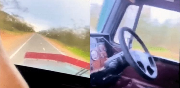 Footage shows a big truck driving down an Australian country road with no one behind the wheel, as the would-be driver sits in the passenger seat with his feet up on the dashboard.