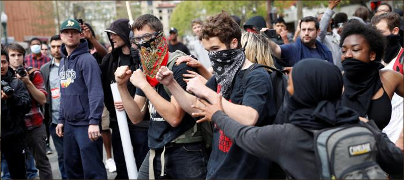 Among the Trump opponents were some counter-protesters dressed in black and wearing masks. The other side included self-described “patriots” and “nationalists”, Trump supporters, free speech advocates, and other groups.
