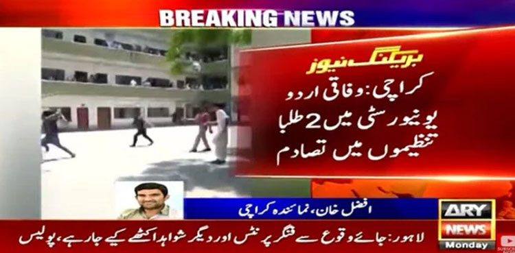 KARACHI: At least two professors sustained injuries in a clash between two student groups at Maulvi Abdul Haq campus of the Federal Urdu University of Arts, Science and Technology (FUUAST) in Karachi, ARY News reported on Monday.