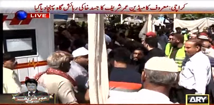 KARACHI: The body of deceased comedy king Umer Sharif is being taken to Clifton area where his funeral prayers will be offered following which he shall be laid to his final abode, in the premises of Saint Abdullah Shah Ghazi (R.A)’s shrine, ARY News reported.