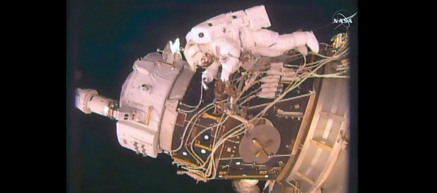 Americans Jeff Williams and Kate Rubins floated outside the orbiting laboratory for a spacewalk lasting five hours and 58 minutes to attach the first of two international docking adaptors.