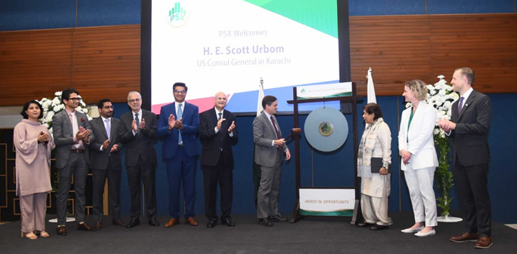 KARACHI: The Consul General of United States of America in Karachi, Mr. Scott Urbom, struck the gong at a gong ceremony held at the Pakistan Stock Exchange (PSX) to open the trading day.