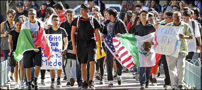 Students in east Los Angeles, some of them carrying signs that read “Rise Up” and “Together We Stand” as well as American and Mexican flags, marched peacefully to a plaza in Boyle Heights, a predominantly Hispanic neighborhood.