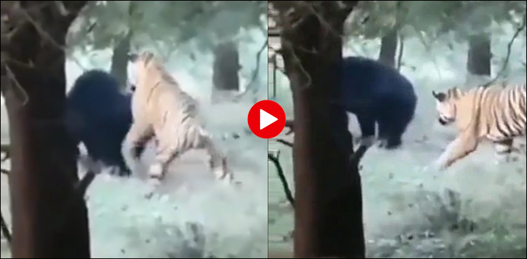 The video showed a tiger moving stealthily towards a sloth bear. The bear was likely busy searching for food. The tiger closed in slowly and stunned the bear with its paws. The bear responded in no time by returning the attack and made the tiger run for his own safety instead.