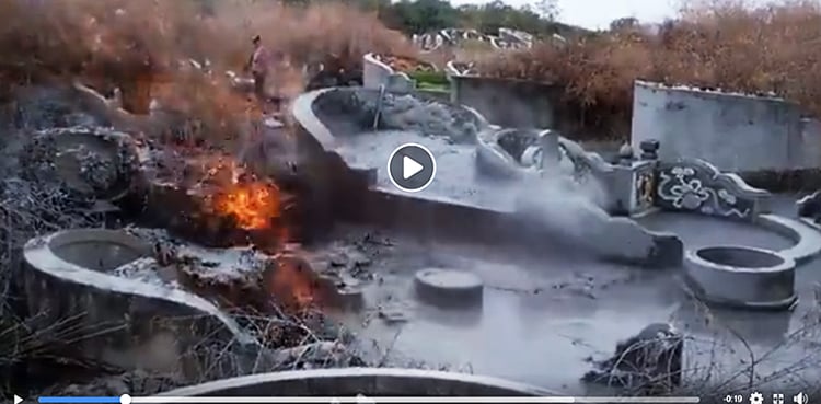 A video of fire and mud bursting from the ground has been viewed hundreds of thousands of times in Facebook posts that claim it shows a possible “ghost fire” burning at a cemetery in Ipoh, Malaysia.