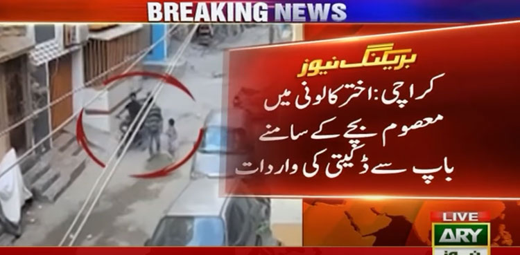 In the CCTV footage available with ARY News, the father and son duo can be seen going home after buying breakfast when they were ambushed by the armed robbers riding a motorcycle.