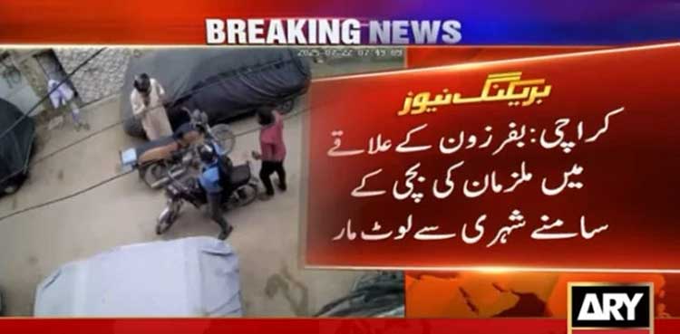 KARACHI: Yet another disturbing incident of street crime has come to light in Karachi as a citizen was robbed in front of his minor daughter, ARY News reported.