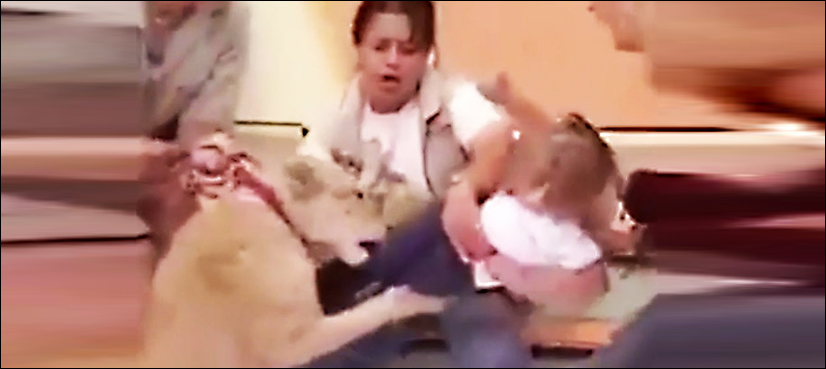 As seen in the footage, the lion gets its claws into the child’s clothing before a bizarre tug-of-war battle plays out with the girl’s mother.