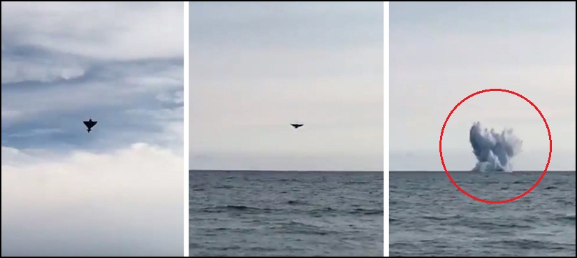 Sickened onlookers can be heard gasping as the Typhoon smashes into the Mediterranean sea, leaving a huge plume of water and debris hanging in the air.