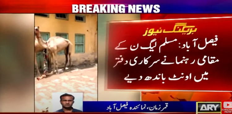 FAISALABAD: Pakistan Muslim League Nawaz (PML-N) Youth Wing Jhumra Amir Liaquat Chattha has kept sacrificial camels in a government office which increased difficulties for the movement of the employees, ARY News reported on Tuesday.