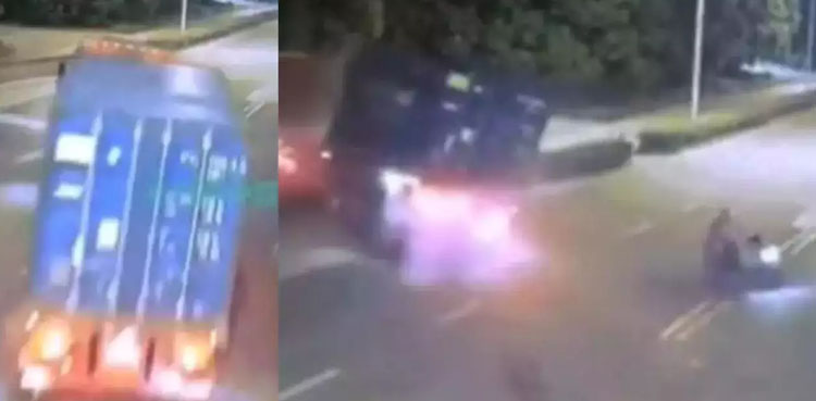 In the video posted on Twitter, a two-wheeler can be seen crossing the road at full speed while a truck appeared out of nowhere.