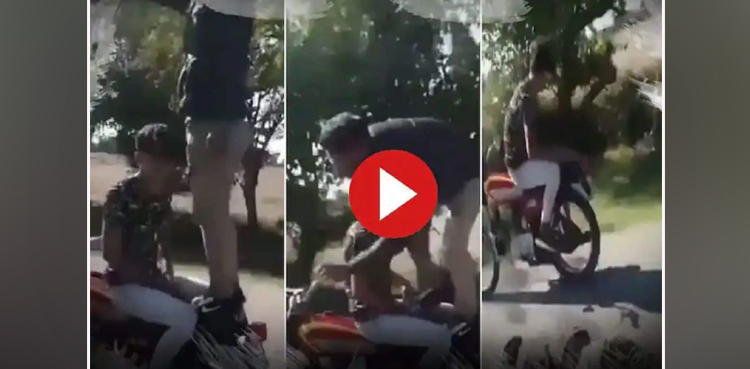The viral video sees one of them standing on the rear side of bike without a driver. His pillion was looking at him instead of watching the road ahead.