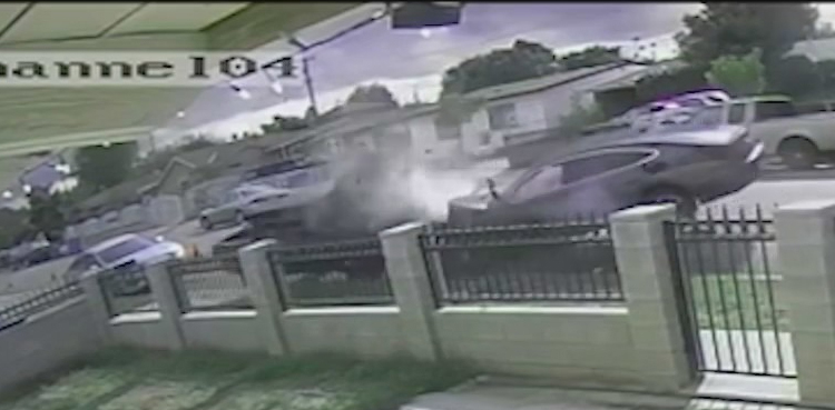 The incident happened on Newburgh Street in Los Angeles state’s Azus city. The horrific video showed the car, travelling at 50 mph, crashing into a parked truck.