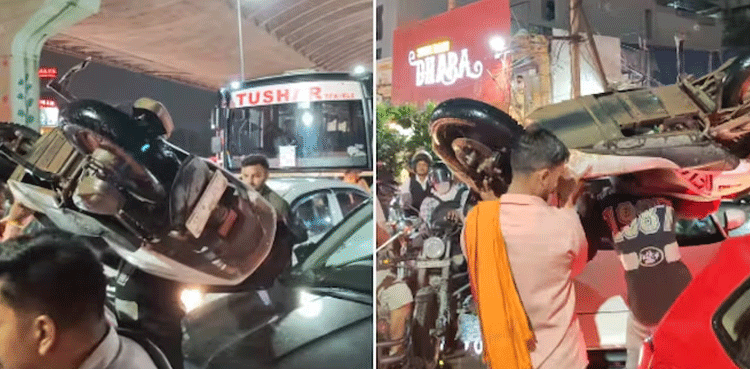In a unique way to beat the chaotic traffic, two men were spotted walking down a jam-packed road in India, balancing a motorcycle on their shoulders as video of the incident went viral.