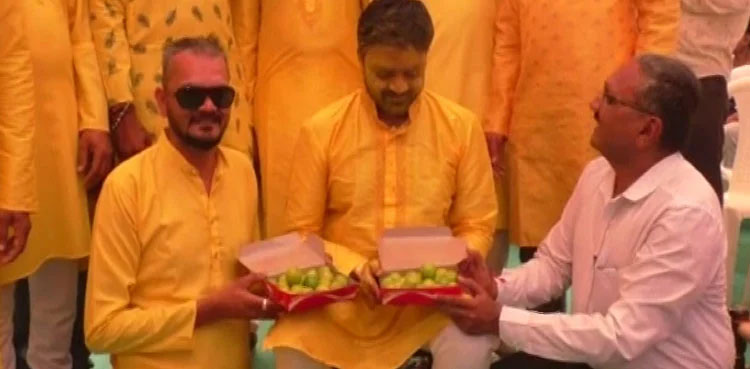 गुजरात: राजकोट के धोराजी शहर में एक शादी समारोह के दौरान लोगों ने दूल्हे को नींबू भेंट किए।
