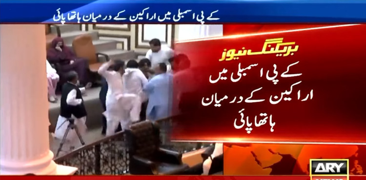 PESHAWAR: Tensions flared in the Khyber Pakhtunkhwa (KP) Assembly on Tuesday as lawmakers engaged in physical fight during the session, ARY News reported.