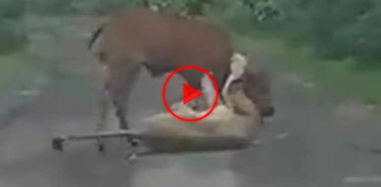 The cow’s attempts to free itself from the lion’s grip were going in vain as seen in the viral video. It dragged the big cat towards the side of the road, but the lion did not let go.