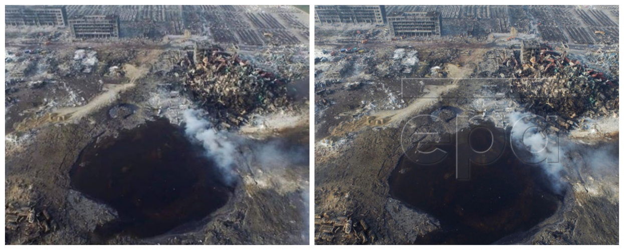 The EPA photo, which can be found on the news agency’s website, is captioned in part: “An aerial view of a large hole in the ground in the aftermath of a huge explosion that rocked the port city of Tianjin, China, 15 August 2015. Explosions and a fireball at a chemical warehouse killed at least 85 people in the north-eastern Chinese port city of Tianjin late on 12 August.”