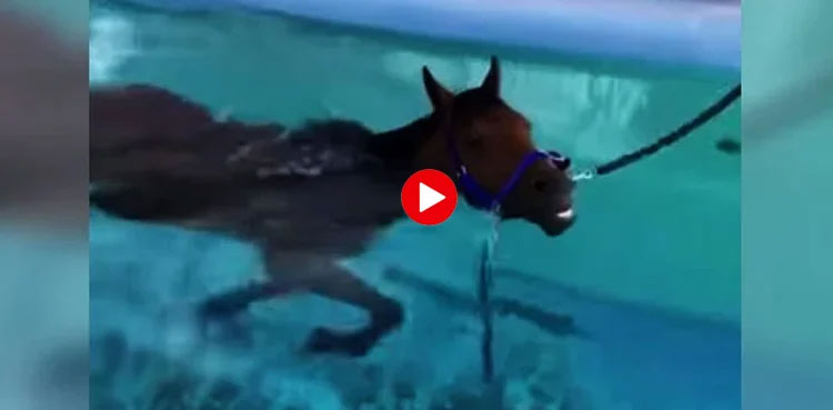 In the recent video, a horse can be seen paddling its way through a pool while its handler holds it by the rope.