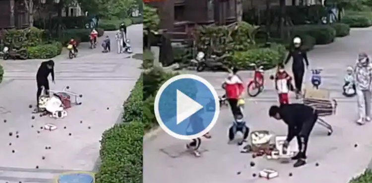 The viral video, shared by Danny Deraney, begins with a man struggling to carry fruit cartons on a shopping trolley. It tripped to the side, spilling the fruits on the pavement.