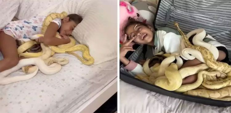 In another similar sort of video, the girl was seen cuddling with 10 snakes while having a nap in the bed.