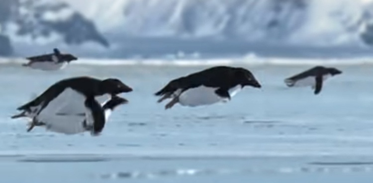 It purports to show penguins taking flight. A voiceover states they are a “recently discovered colony of penguins”.