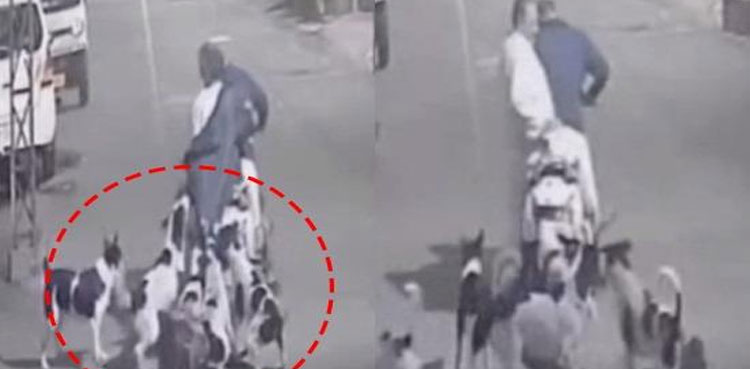 The aggressive stray dogs tore off the jacket of the person sitting behind the scooty. The dogs also tried to bite him but the other person took a stone and acted to hit them after which they ran away. The video of the incident is going viral on social media.