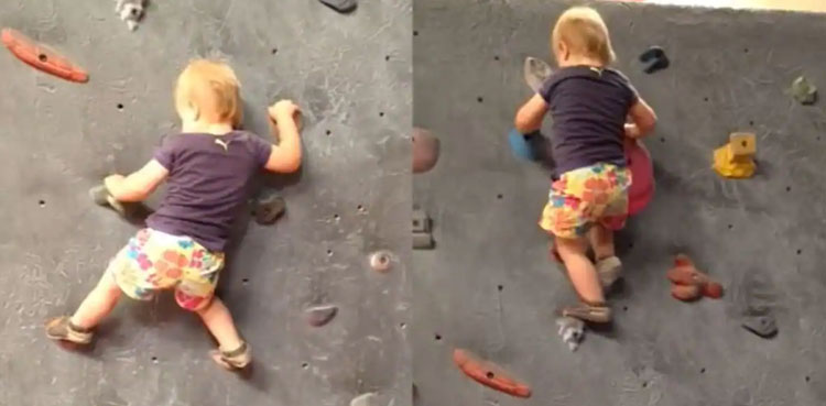 An adorable video of a toddler climbing a bouldering wall with ease has gone viral on social media.