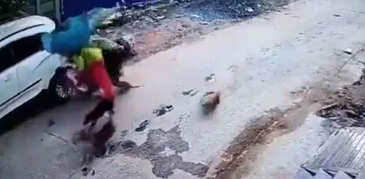 Watch: Woman crashes scooter into car while being chased by stray dogs