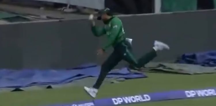 The stunning effort came on the second ball of Mohammad Nawaz’s first over, when Netherlands’ in-form batter Michael Levitt launched a shot that appeared destined to clear the ropes.