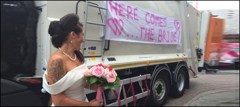 One of the bin bosses donned a chauffeur’s tie before picking up Hilli at her friend’s house before driving her to the Register Office in Birmingham city centre.