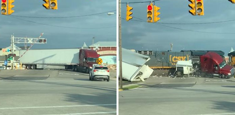 Video footage shows the semi-truck stuck at the railroad level crossing. As the crossing gates begin dropping for an oncoming train, one of its arms drops in right between the truck and trailer.