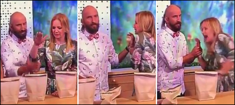 In a bizarre footage, TV presenter got the sharp end of the stick pierced into her hand when she volunteered to participate in a magic trick live on air.