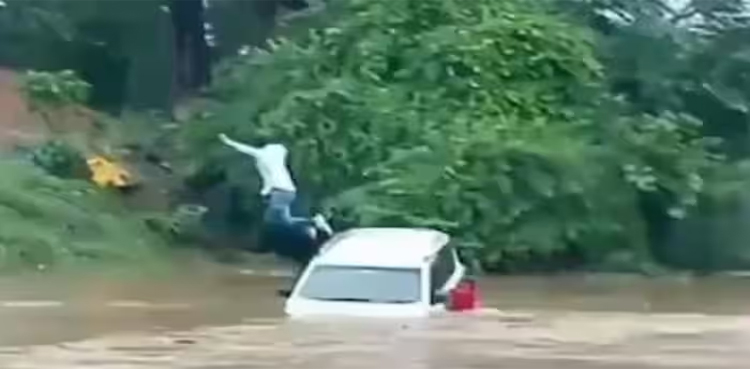 Later, one of them can be seen getting back inside the car as it was swept away and moved through the water.