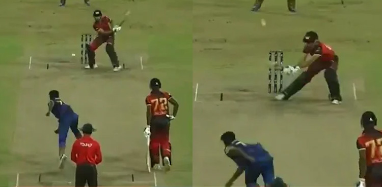 Haris came to bat as Kandy Falcons had a flying start. He played a scoop over the wicketkeeper’s head with the back of his bat which went over the rope for a six in the last over of the powerplay in Kandy Falcons’ innings.