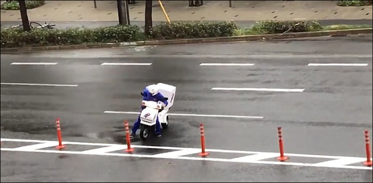 OSAKA, JAPAN: A pizza delivery guy takes his job a bit too seriously as he battles the Typhoon Jebi to reach the pizza awaiting customer.